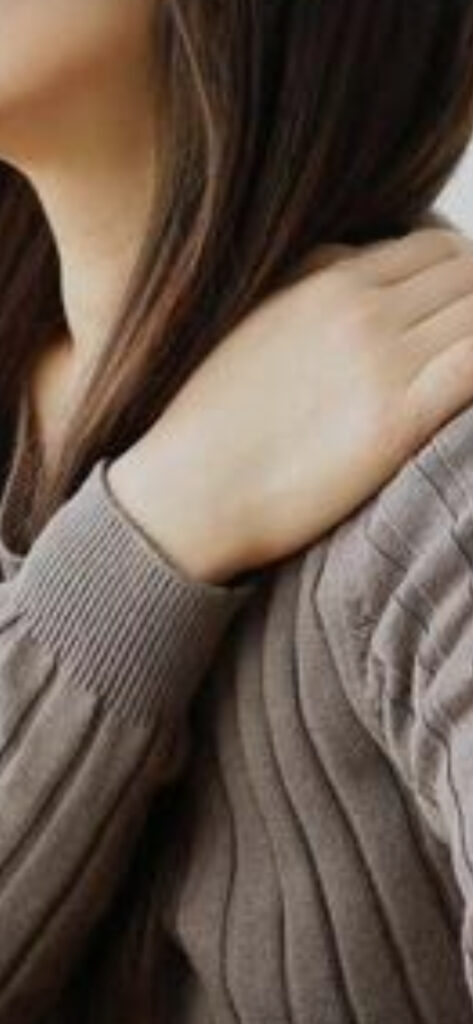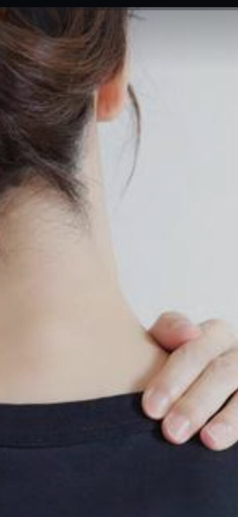 が蓄積しゴリゴリしたした塊、筋繊維の収縮を感じ肩こりを自覚します)