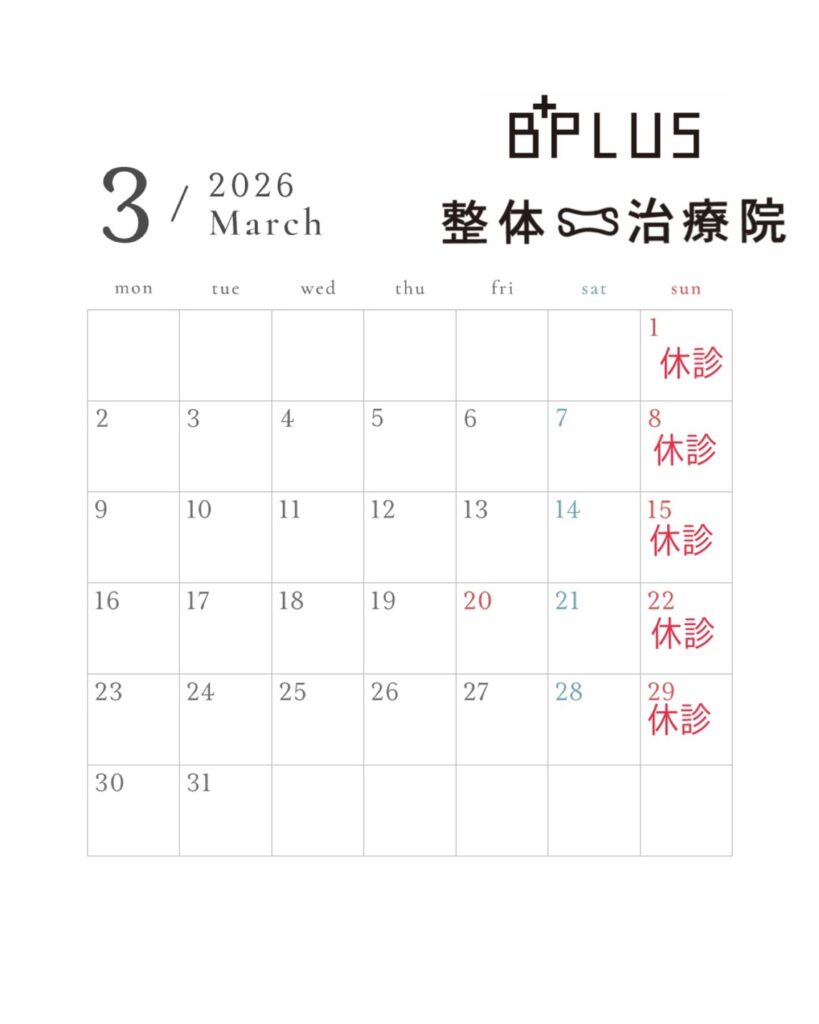 2026.2.24 3月のお知らせ!! 3月の休診日とお休みです☺ 冬の雪かきや運転で冬の疲れが どっと出てきて、痛みや疲れで 来院される方増えています 我慢、無理はせず身体の事 ご相談下さい☺ お待ちしております<m(__)m> お知らせ一覧